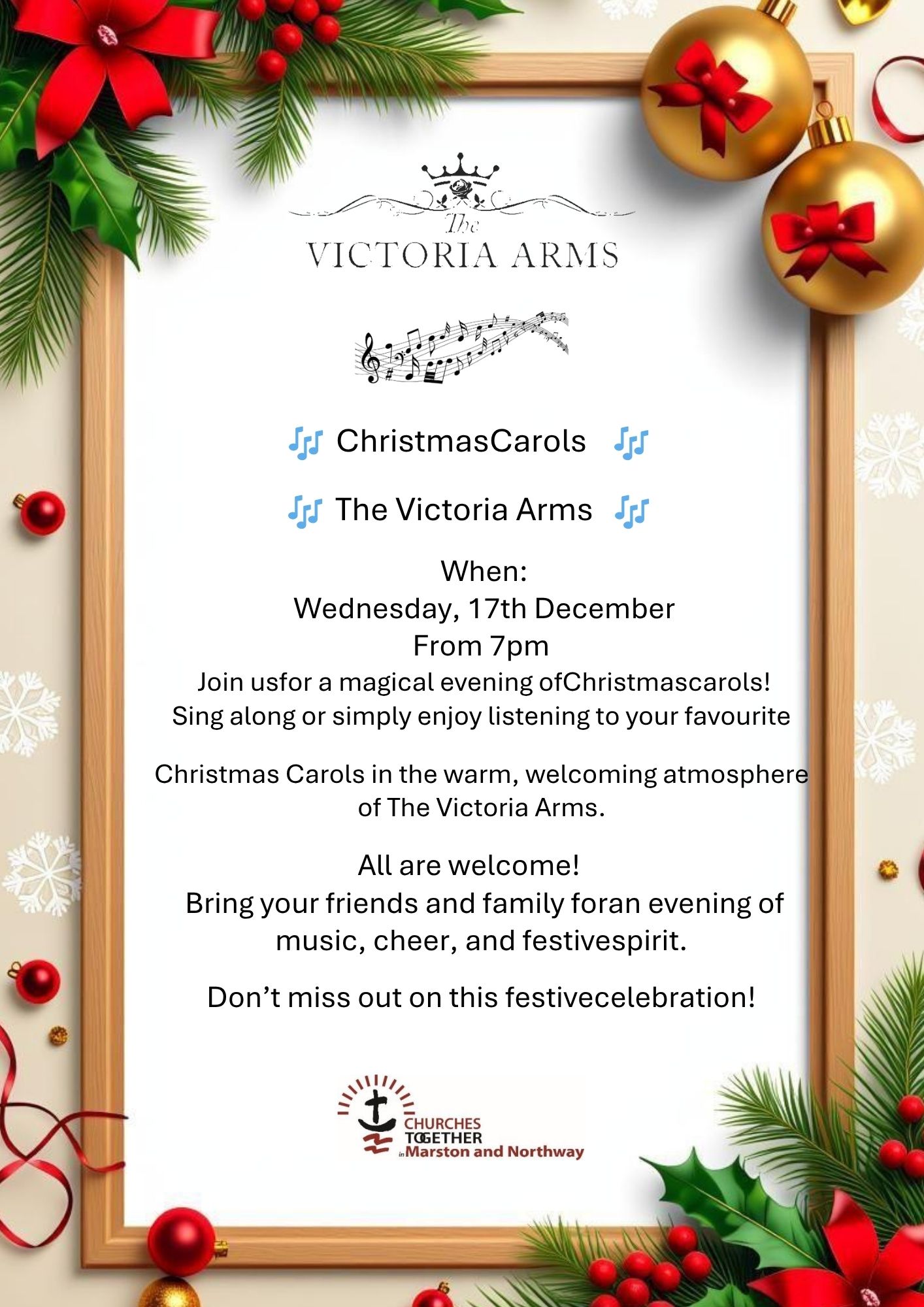 Christmas Carols, 17th December at 7pm. Organised by Churches Together in Marston and Northway.